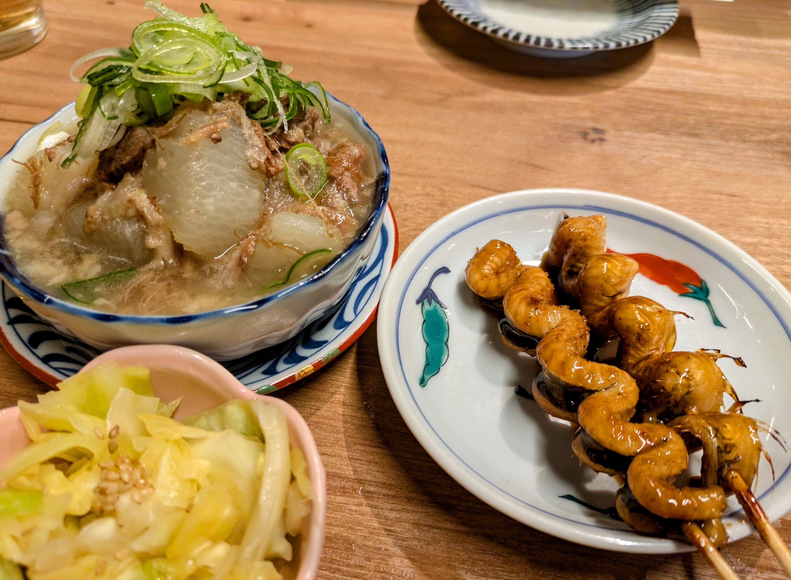 まず頼んだのはこちらのお店の看板メニューとなっている「くりから」と呼ばれる【穴子串】と【牛すじ煮込み】