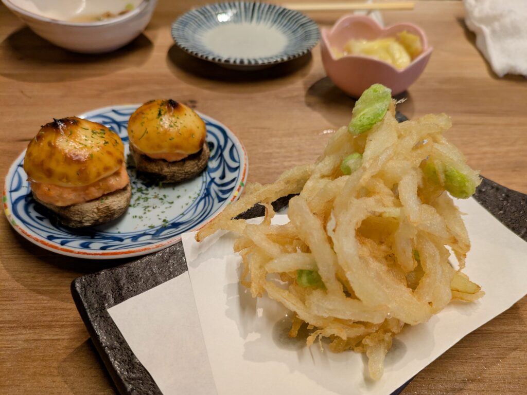 その他、季節のメニューから【新じゃが椎茸焼き(390円)】や【新玉ねぎと空豆のかき揚げ(390円)】や、おすすめ穴子料理の一つである【大穴巻き(ハーフ)】も注文