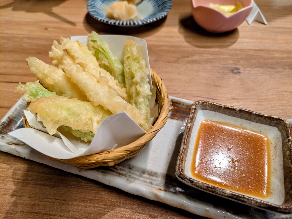特に長ネギの天ぷらはついてくるタレが胡麻だれのようなコクのあるタレで、非常においしかったです!