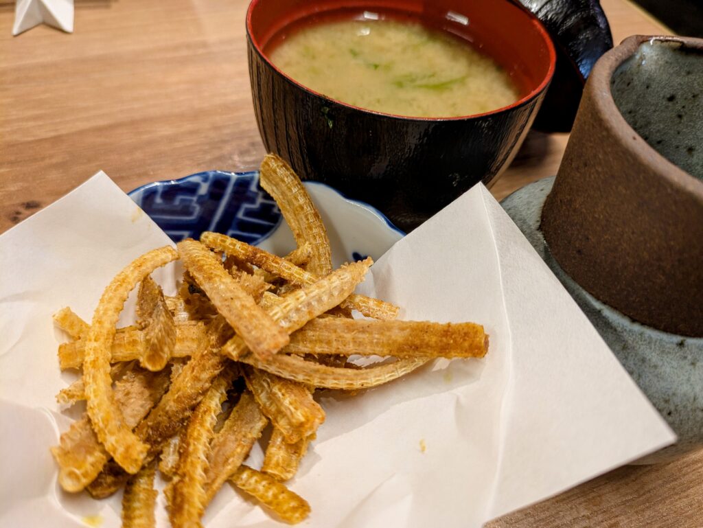 そして終盤に頼んだのが【刺身の五点盛り】と【長ネギの天ぷら】【穴子骨せんべい】