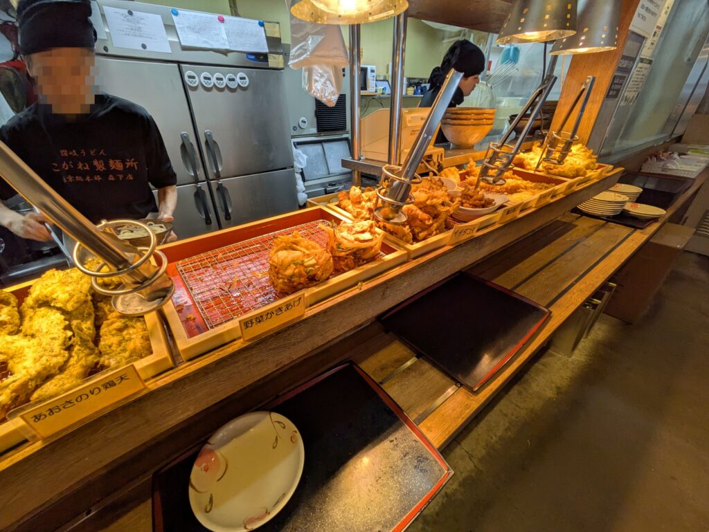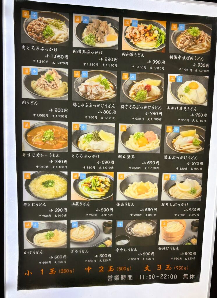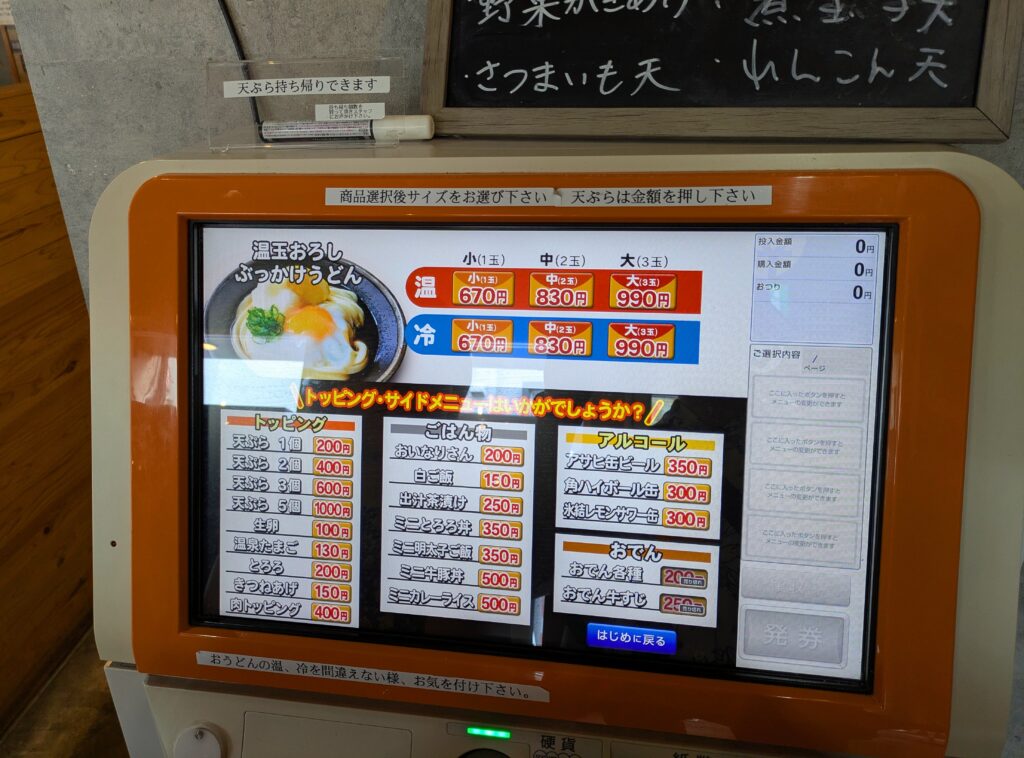 様々なメニューがあって迷ってしまうので、お店の外に置かれたメニューを見てどのうどんにするか、天ぷらをトッピングするかを事前に決めてから並ぶといいかもしれません。