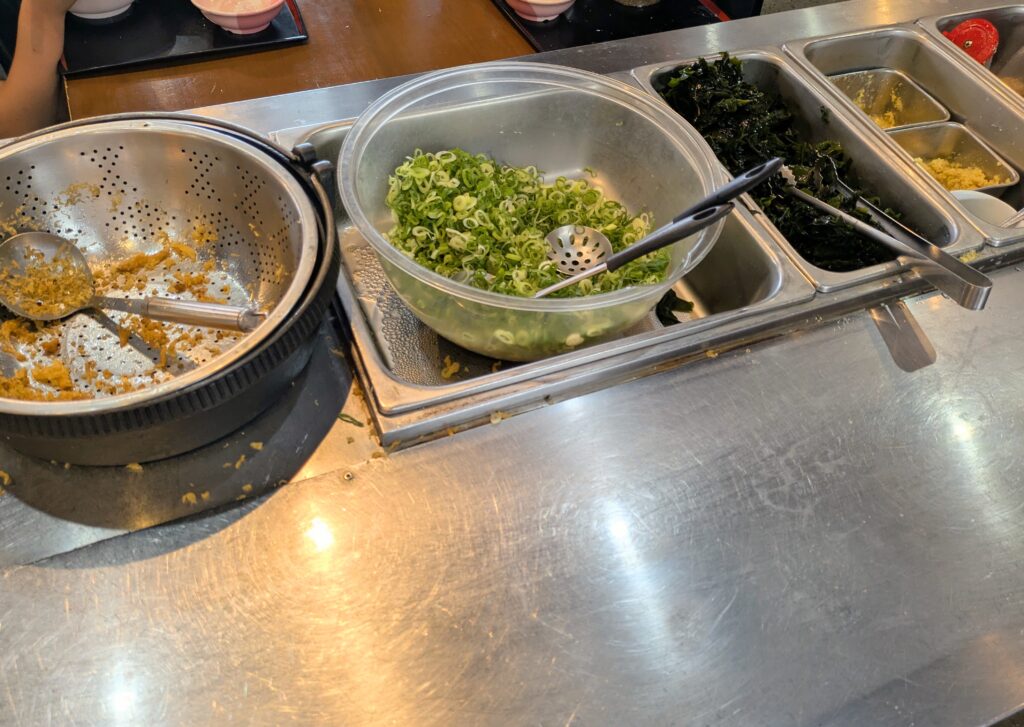 またネギ・わかめ・天かす・しょうがは自分で好きな量を取れるスタイルで、利用者が自分で調整できるのが楽しいポイント!