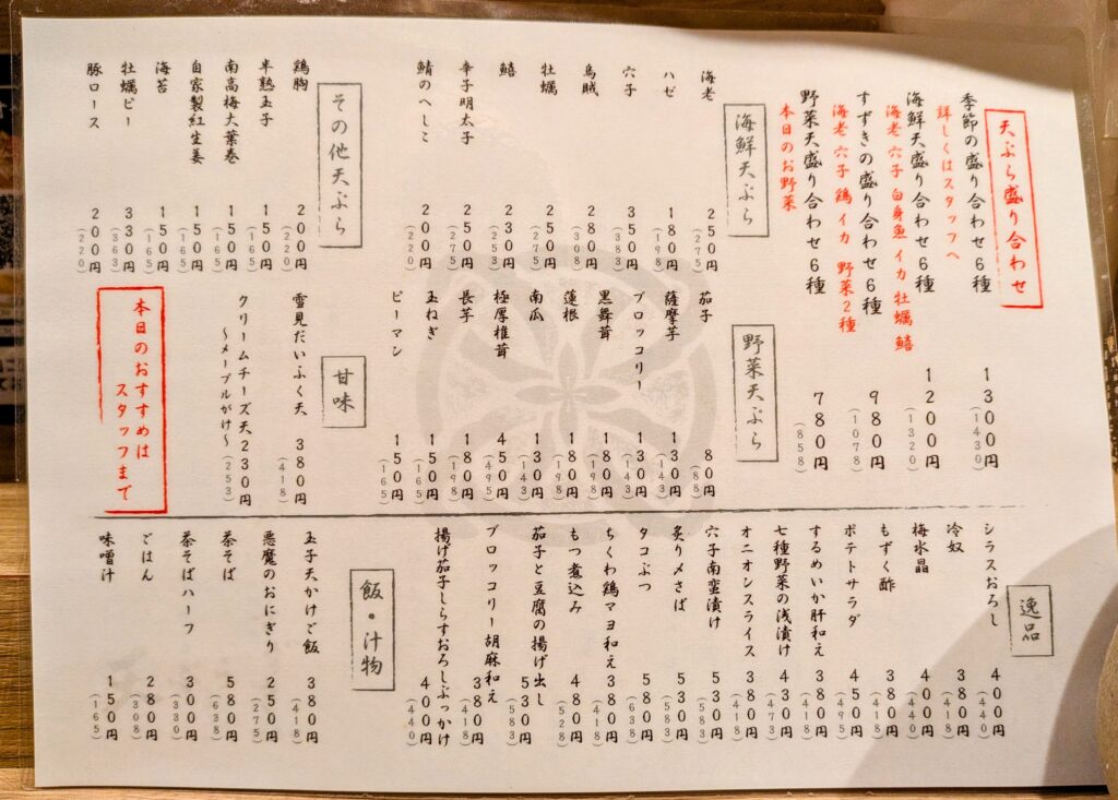 もちろん1個からの注文も可能で、安いものでは茄子の80円、その他の天ぷらも100円~300円ほどと気軽に注文できる価格なのが◎