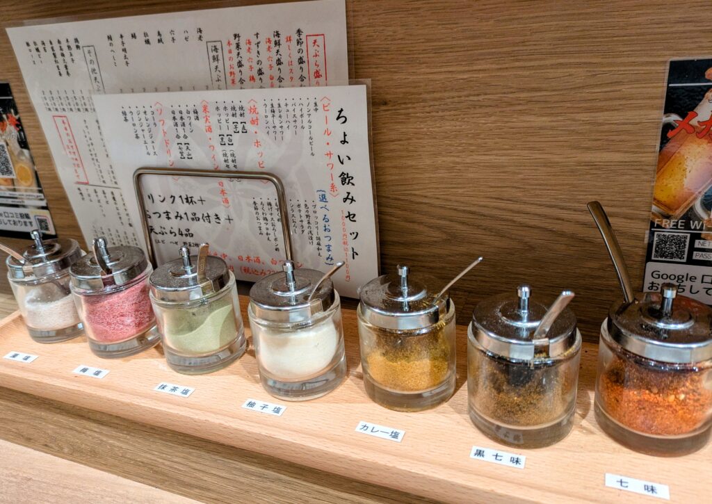 またテーブルには下の写真のように藻塩カレー塩抹茶塩など、計5種類の塩2種類の七味があり、添えられている天つゆだけでなく、自分好みのお塩で天ぷらを楽しむことができます!